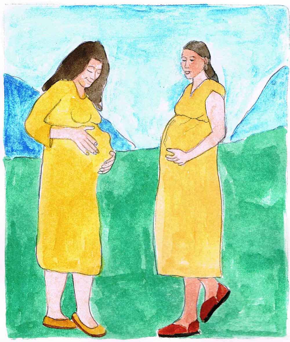 Das kleine Kind hörte, als Maria zu Elisabet „Guten Tag“ sagte.